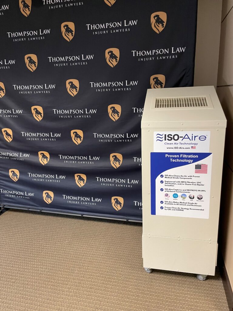 ISO-Aire delivers proven COVID-19 mitigation strategies for indoor air quality recommended by the CDC and ASHRAE. The air purifiers installed throughout Thompson law office are engineered with multiple layers of unmatched medical-grade filtration to capture and destroy 99.99% of viruses and emerging variants, as well as bacteria, mold, pollen, dust, VOCs, and smoke.